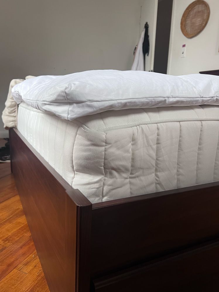 The topper is generously filled and thoughtfully constructed, with a box-stitch design that keeps the down evenly distributed—no clumping or shifting. It also has built-in elastic straps, so it stays in place very well.