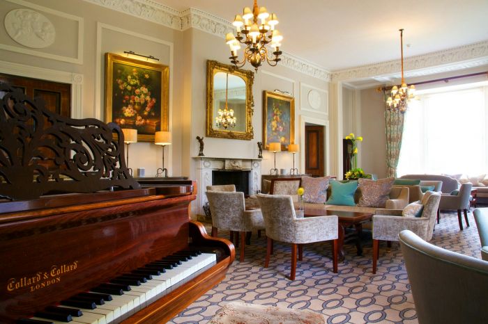 Rooms in the main house carry the hallmarks of period charm—gently uneven floors that speak to the building’s age, deep, wide windowsills perfect for settling into with a book, and expansive views across the lake framed by heavy drapes that can be drawn back to reveal shifting light and colour. The interiors balance old-world character with thoughtful modern touches: discreetly updated en suites, luxurious linens, and fine craftsmanship throughout.