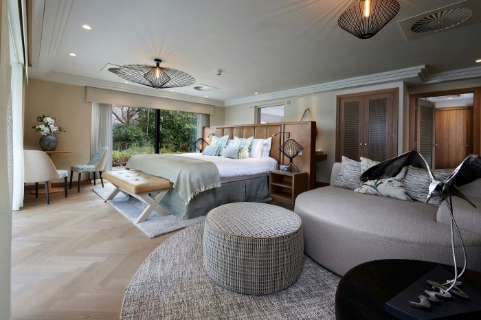 By contrast, the lakeside pavilion suites open onto a different world of indulgence. Here, clean architectural lines meet floor-to-ceiling glass, offering uninterrupted views of the water and hills beyond. Freestanding tubs invite languid soaks, their placement carefully chosen so you can watch the lake while immersed in warmth. Outside, private patios feature firepits that burn steadily into the night, making these suites feel like a private sanctuary—at once intimate and expansive—where contemporary luxury softens the edges of classic grandeur.