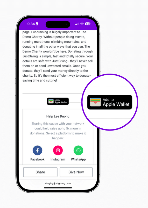 • Anyone can add any Fundraising Page on JustGiving to their Apple Wallet, without being logged into JustGiving or being the owner of that page.