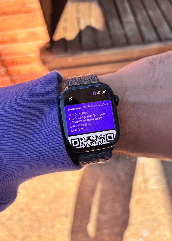 Say one of your supporters is at a parkrun, chatting about their upcoming fundraising challenge. Instead of looking up URLs or promising to “send the link later,” they can pull out their phone, open Wallet, and boom, their page’s QR code is right there to scan.