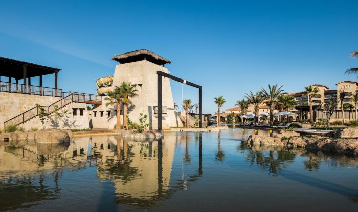 Set against a backdrop of sand dunes and desert mountains, the salt water Lagoon is massive—so large you can kayak across it. One edge has a beach-style entry with soft sand. Another has twin waterslides and a rope swing. Shaded cabanas circle the perimeter. Paddleboards glide past swim-up bars. It’s active without being chaotic. Families find space to play. Couples find space to retreat.