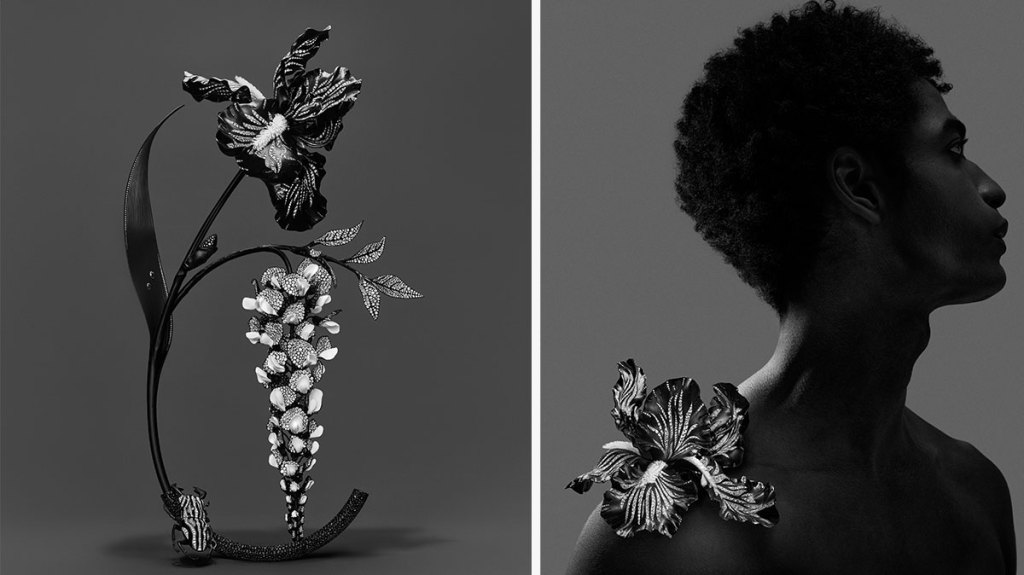 Seen here is an arrangement of wisteria and iris with a small stage beetle climbing a stem. The flowers rise from an aluminium and titanium vase set with black spinels. The iris, wisteria, and beetle are made from diamonds, white ceramic, aluminum, titanium, and white gold (the bud of the iris is paved with black spinels). The iris and beetle can be worn as a brooch, while the wisteria is a headpiece weighing just 150 grams. This incredible work of art took 4,685 hours of work.