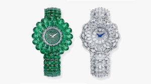 Image Credit: Chopard Chopard features its high jewelry on the red carpet of the Cannes Film Festival each year, so in Paris it predominately focused on jeweled watches. While there are plenty of gem-set and stone dial watches to make one’s heart sing, the timepiece set with 38.99-carats of emeralds, additional emeralds and diamonds set in 18-karat white gold and it’s sister in 34.37-carats of diamonds set in 18-karat white gold are certainly stomp out the competition.