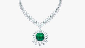 Image Credit: Graff This exquisite Graff 1963 necklace is set with a total of 7,790 carats of custom-cut oval-, baguette-, and round-cut diamonds totaling over 129 carats. But, upon closer inspection, you will notice a wink emeralds lining the edges of its sculptural form. According to CEO François Graff, it is the most technically challenging and intricate jewelry suites the company has ever created.