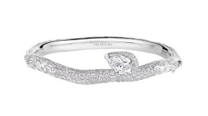 DeBeers Essence of Nature: Chapter 2 delves into the company’s four diamond regions: Namibia, Botswana, South Africa, and Canada. This elegant bracelet features a pear-shaped diamond nestled atop an 18-karat white gold bangle adorned in diamonds. It mimics the form of the Camelthorn tree native to Namibia’s desert landscapes. It’s simple, but with a twist that will make a head turn for a second glance.
