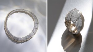 Image Credit: Vhernier Vhernier’s signature look is so strong as to be instantly recognizable to those in the know. This season, it took its classic form and dazzled it in pavé diamonds set in rose gold with 2,695 diamonds in 19.35 carats for the Ardis Forma di Luce necklace and 550 diamonds for total of 3.60 carats in the matchingring.